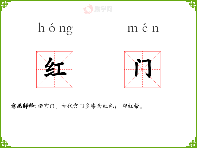 红门的意思是:指宫门。古代宫门多漆为红色; 即红帮。