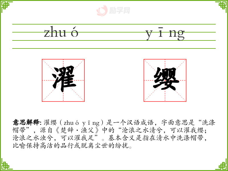 濯缨(zhuó yīng)是一个汉语成语,字面意思是“洗涤帽带”,源自《楚辞·渔父》中的“沧浪之水清兮,可以濯我缨;沧浪之水浊兮,可以濯我足”。基本含义是指在清水中洗涤帽带,比喻保持高洁的品行或脱离尘世的纷扰。