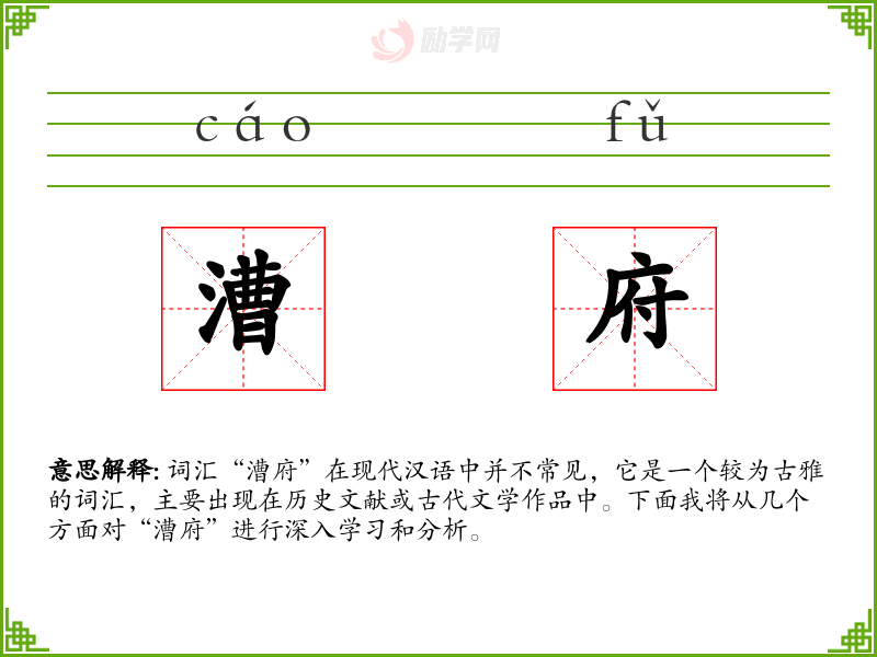 “漕府”作为一个历史词汇,虽然在现代汉语中不常见,但它承载了丰富的历史文化信息。了解这一词汇有助于我们更好地理解古代*的行政管理和经济制度,对于深入学历史和文化具有重要意义。