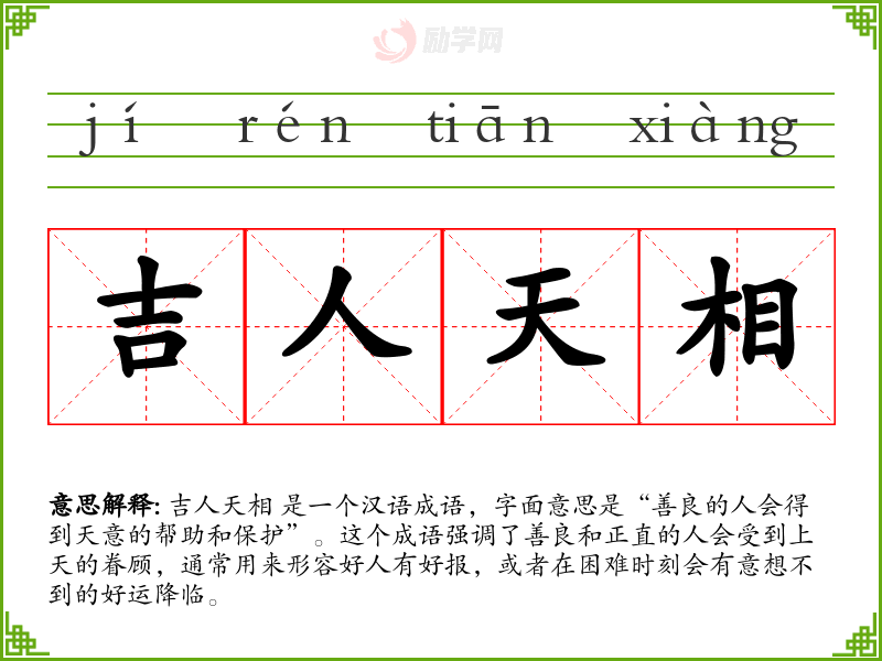 吉人天相 是一个汉语成语,字面意思是“善良的人会得到天意的帮助和保护”。这个成语强调了善良和正直的人会受到上天的眷顾,通常用来形容好人有好报,或者在困难时刻会有意想不到的好运降临。