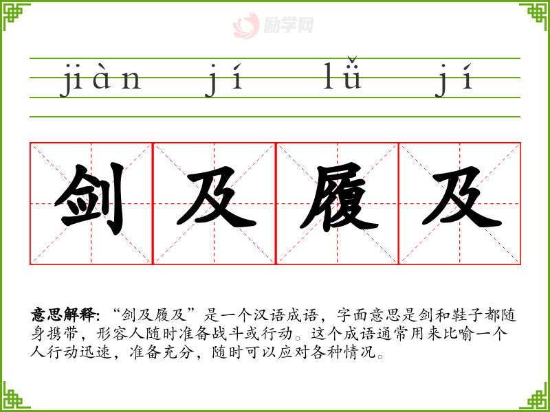 “剑及履及”是一个汉语成语,字面意思是剑和鞋子都随身携带,形容人随时准备战斗或行动。这个成语通常用来比喻一个人行动迅速,准备充分,随时可以应对各种情况。