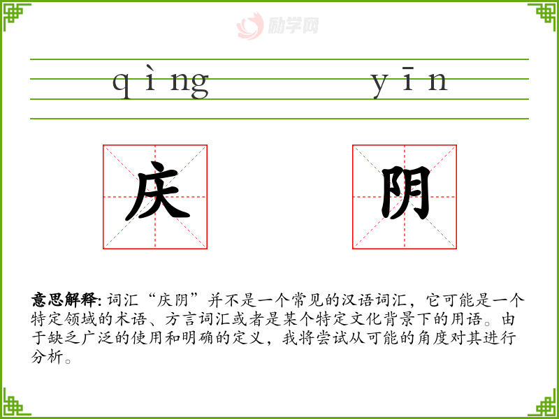 由于“庆阴”不是一个标准词汇,我们无法给出确切的字面意思和基本含义。它可能是由“庆”和“阴”两个字组合而成的,其中“庆”通常表示庆祝、喜庆,而“阴”则可能指阴暗、阴性或阴间等含义。