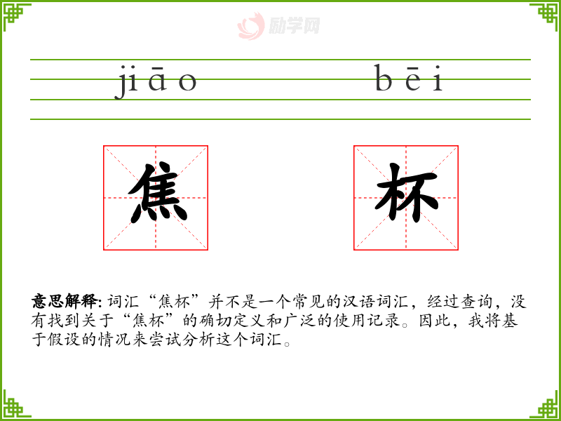 词汇“焦杯”并不是一个常见的汉语词汇,经过查询,没有找到关于“焦杯”的确切定义和广泛的使用记录。因此,我将基于假设的情况来尝试分析这个词汇。