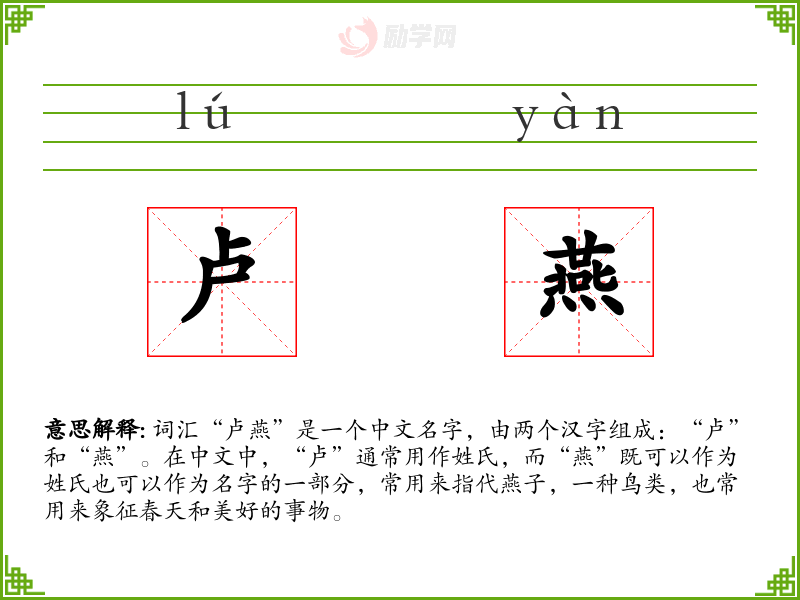 - 词源:“卢”作为一个古老的姓氏,其来源有多种说法,有的认为与古代的卢国有关。“燕”则源自燕子,古代常用来象征美好的事物。