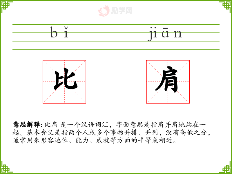 比肩 是一个汉语词汇,字面意思是指肩并肩地站在一起。基本含义是指两个人或多个事物并排、并列,没有高低之分,通常用来形容地位、能力、成就等方面的平等或相近。