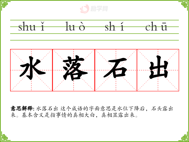 水落石出 这个成语的字面意思是水位下降后,石头露出来。基本含义是指事情的真相大白,真相显露出来。