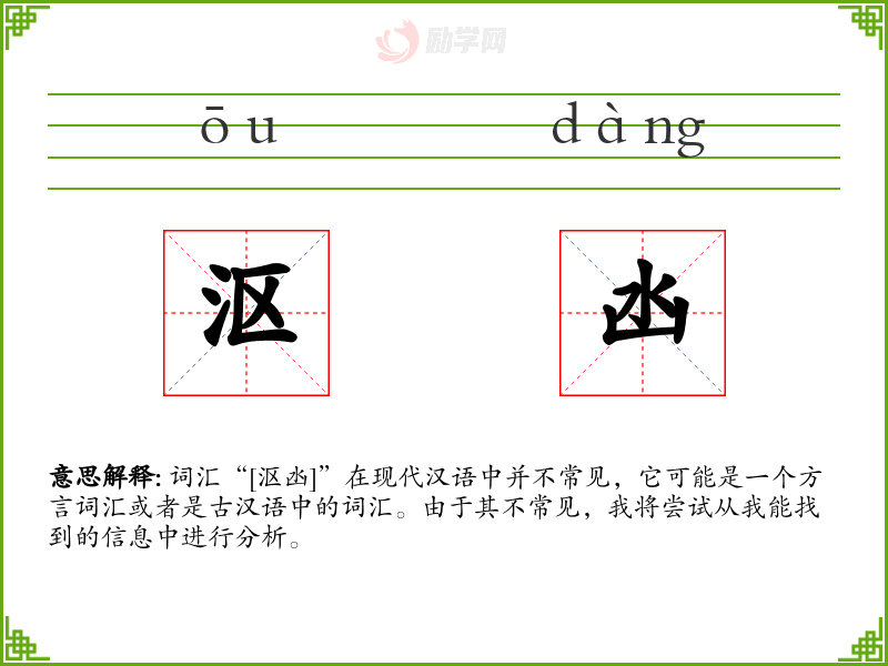 词汇“[沤凼]”在现代汉语中并不常见,它可能是一个方言词汇或者是古汉语中的词汇。由于其不常见,我将尝试从我能找到的信息中进行分析。