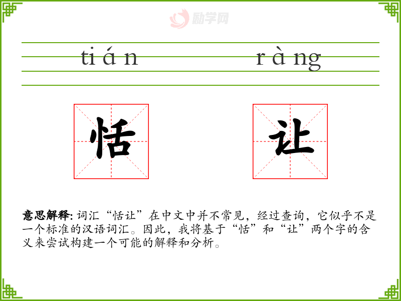 词汇“恬让”在中文中并不常见,经过查询,它似乎不是一个标准的汉语词汇。因此,我将基于“恬”和“让”两个字的含义来尝试构建一个可能的解释和分析。