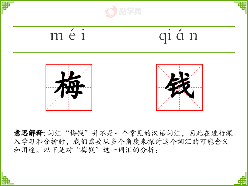 词汇“梅钱”并不是一个常见的汉语词汇,因此在进行深入学*和分析时,我们需要从多个角度来探讨这个词汇的可能含义和用途。以下是对“梅钱”这一词汇的分析:
