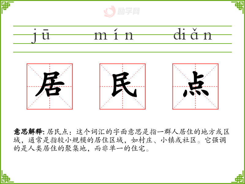 居民点:这个词汇的字面意思是指一群人居住的地方或区域,通常是指较小规模的居住区域,如村庄、小镇或社区。它强调的是人类居住的聚集地,而非单一的住宅。