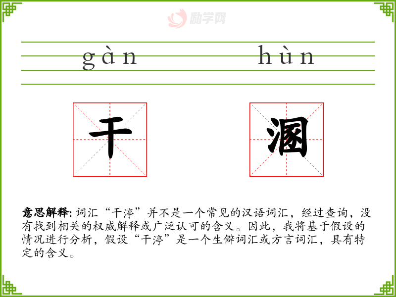 词汇“干渟”并不是一个常见的汉语词汇,经过查询,没有找到相关的权威解释或广泛认可的含义。因此,我将基于假设的情况进行分析,假设“干渟”是一个生僻词汇或方言词汇,具有特定的含义。