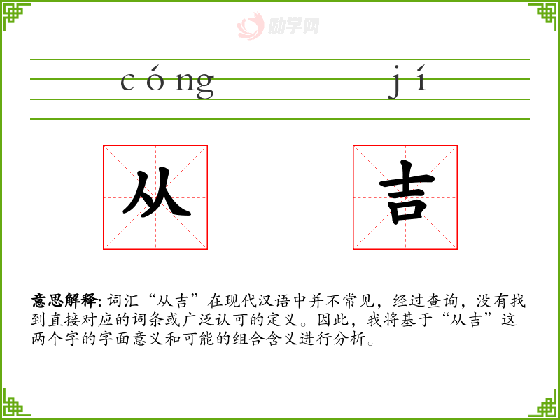 词汇“从吉”在现代汉语中并不常见,经过查询,没有找到直接对应的词条或广泛认可的定义。因此,我将基于“从吉”这两个字的字面意义和可能的组合含义进行分析。