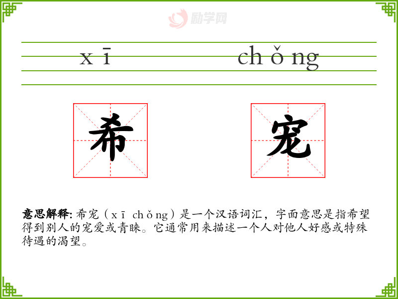 希宠(xī chǒng)是一个汉语词汇,字面意思是指希望得到别人的宠爱或青睐。它通常用来描述一个人对他人好感或特殊待遇的渴望。