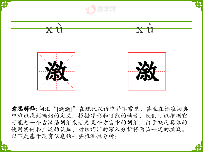 总的来说,“[漵漵]”是一个不常见的词汇,其具体含义和用法需要更多的上下文信息来确定。在现代汉语中,它可能没有广泛的应用,但在特定的文学或方言环境中可能具有一定的意义。