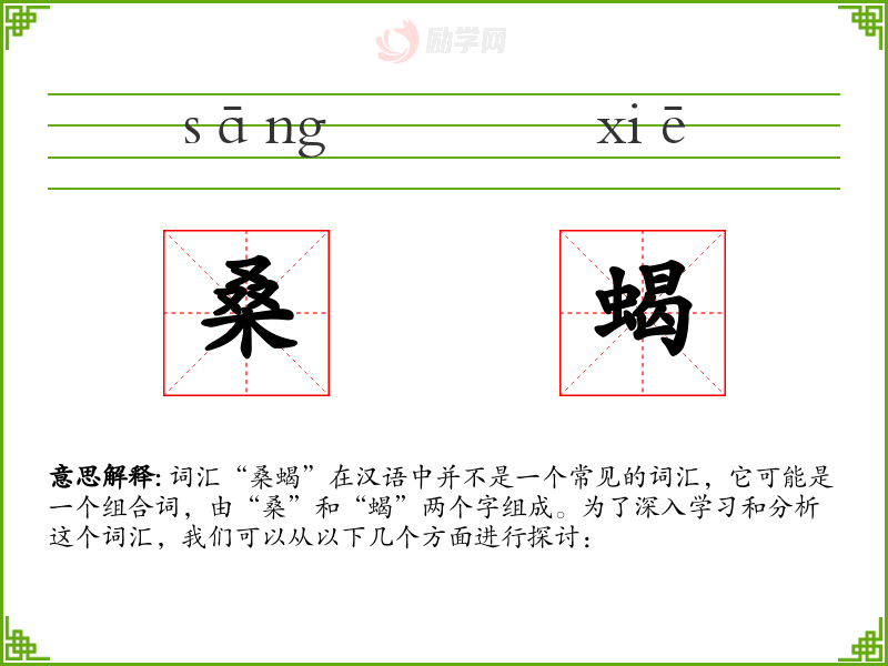 词汇“桑蝎”在汉语中并不是一个常见的词汇,它可能是一个组合词,由“桑”和“蝎”两个字组成。为了深入学习和分析这个词汇,我们可以从以下几个方面进行探讨: