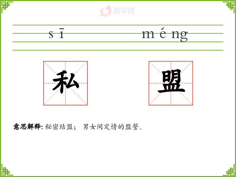 私盟的意思是:秘密结盟; 男女间定情的盟誓。