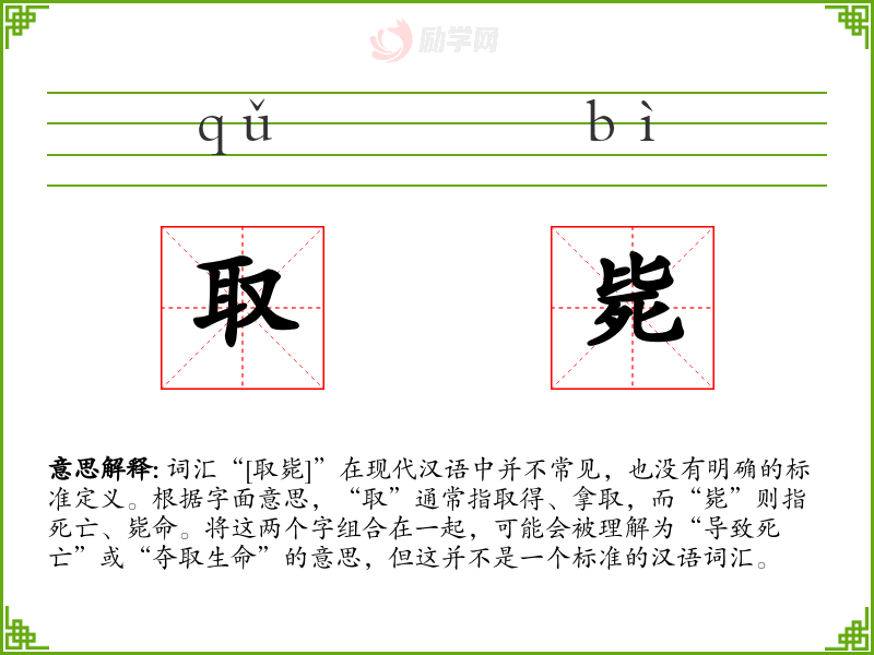词汇“[取毙]”在现代汉语中并不常见,也没有明确的标准定义。根据字面意思,“取”通常指取得、拿取,而“毙”则指死亡、毙命。将这两个字组合在一起,可能会被理解为“导致死亡”或“夺取生命”的意思,但这并不是一个标准的汉语词汇。