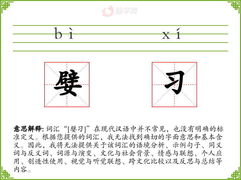 词汇“[嬖习]”在现代汉语中并不常见,也没有明确的标准定义。根据您提供的词汇,我无法找到确切的字面意思和基本含义。因此,我将无法提供关于该词汇的语境分析、示例句子、同义词与反义词、词源与演变、文化与社会背景、情感与联想、个人应用、创造性使用、视觉与听觉联想、跨文化比较以及反思与总结等内容。