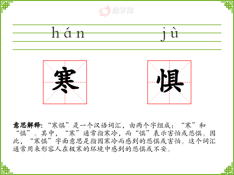 在文学作品中,“寒惧”可以用来描绘人物在严寒环境中的心理状态,增强氛围的紧张感。在口语中,这个词汇可能不常用,但在描述极端天气或环境时,人们可能会使用类似的表达。在专业领域,如气象学或心理学,这个词汇可能被用来描述特定的生理或心理反应。