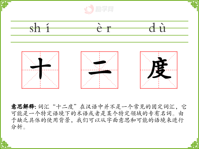 “十二度”作为一个词汇,其意义和使用可能需要依赖于具体的语境。在语言学*和表达中,了解特定词汇在不同语境中的含义和用法,有助于丰富我们的词汇量和表达能力。