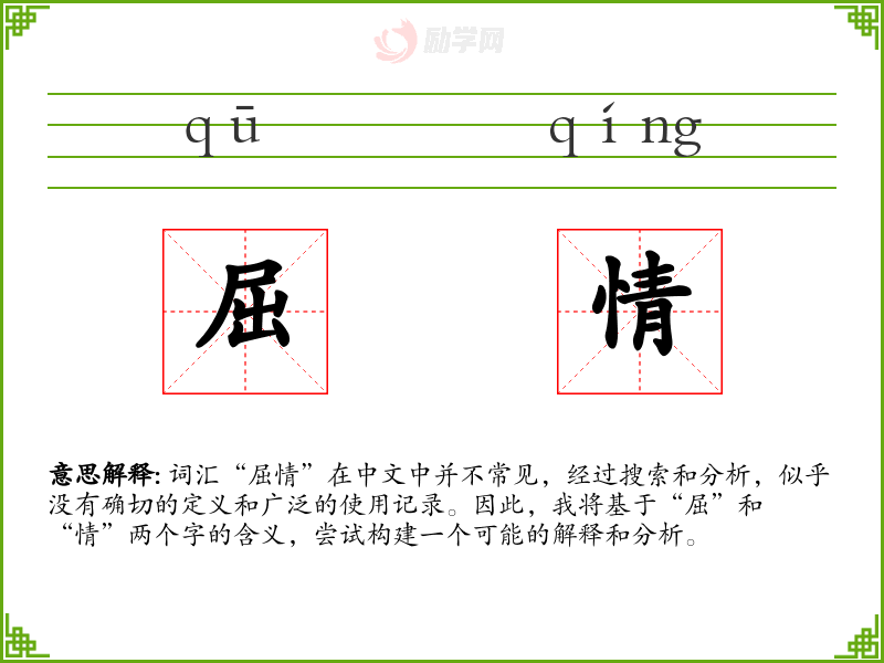词汇“屈情”在中文中并不常见,经过搜索和分析,似乎没有确切的定义和广泛的使用记录。因此,我将基于“屈”和“情”两个字的含义,尝试构建一个可能的解释和分析。