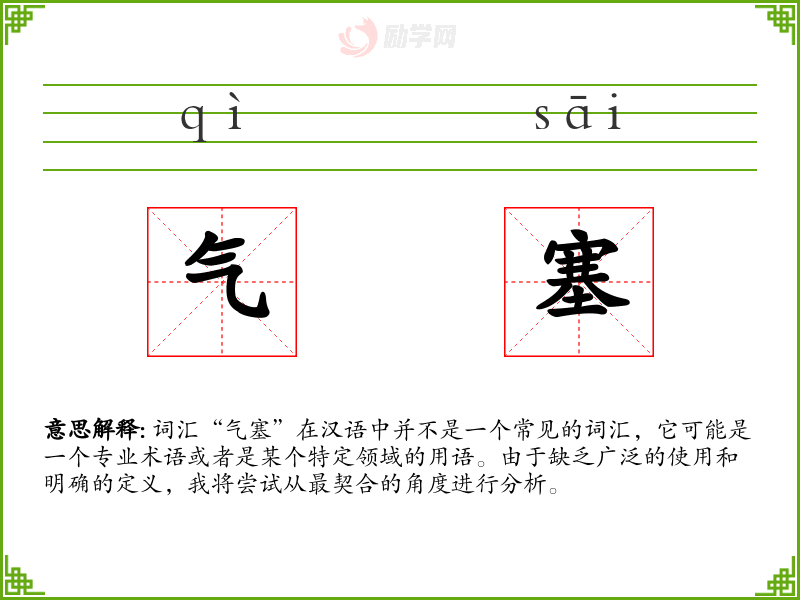 词汇“气塞”在汉语中并不是一个常见的词汇,它可能是一个专业术语或者是某个特定领域的用语。由于缺乏广泛的使用和明确的定义,我将尝试从最契合的角度进行分析。