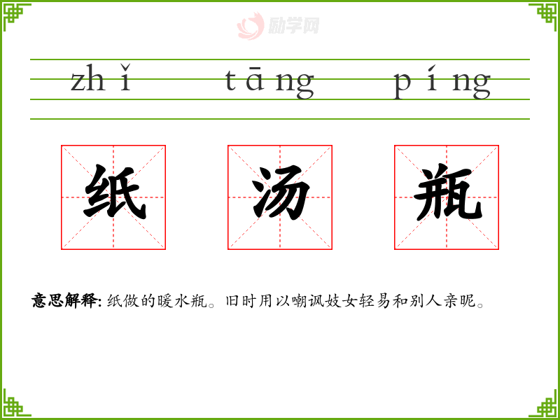 纸汤瓶的意思是:纸做的暖水瓶。旧时用以嘲讽妓女轻易和别人亲昵。