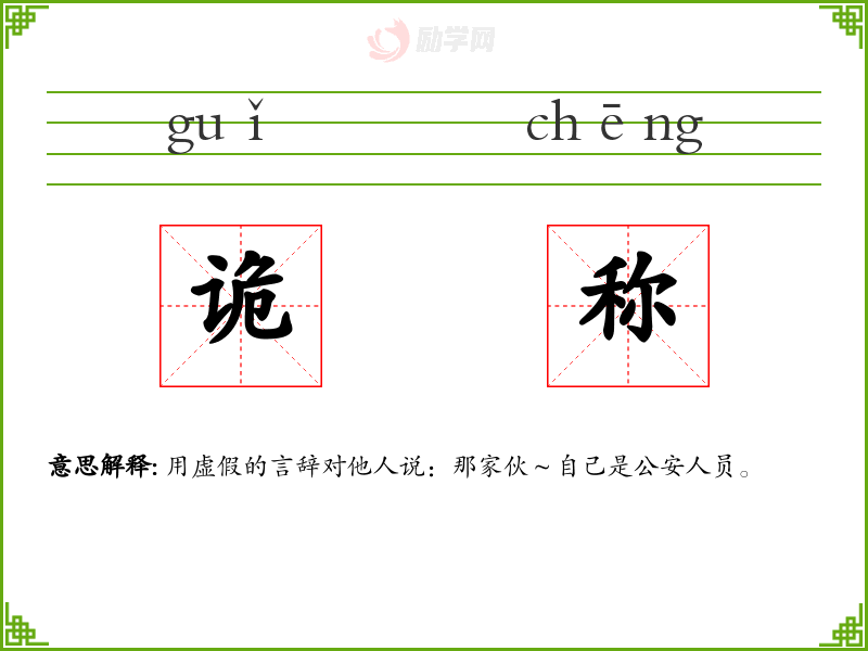 诡称的意思是:用虚假的言辞对他人说:那家伙~自己是公安人员。