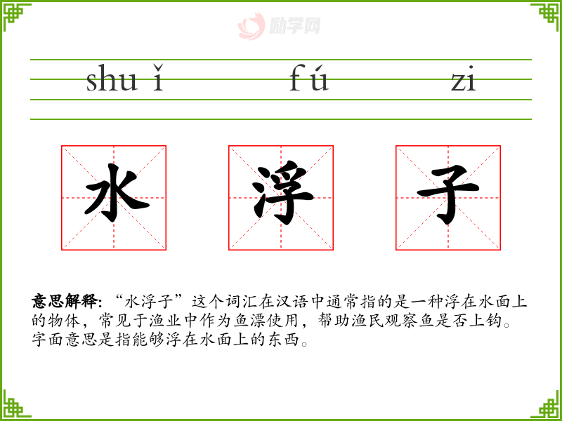 “水浮子”这个词汇在汉语中通常指的是一种浮在水面上的物体,常见于渔业中作为鱼漂使用,帮助渔民观察鱼是否上钩。字面意思是指能够浮在水面上的东西。