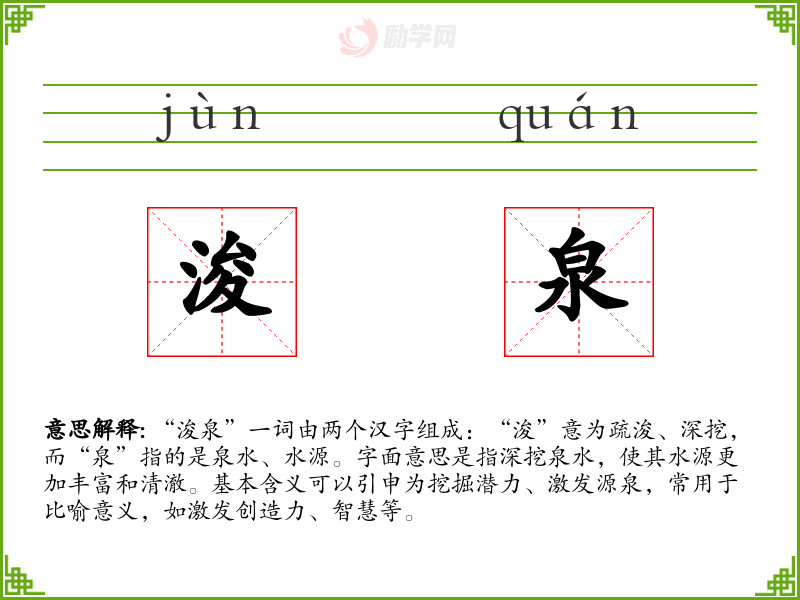 “浚泉”一词由两个汉字组成:“浚”意为疏浚、深挖,而“泉”指的是泉水、水源。字面意思是指深挖泉水,使其水源更加丰富和清澈。基本含义可以引申为挖掘潜力、激发源泉,常用于比喻意义,如激发创造力、智慧等。