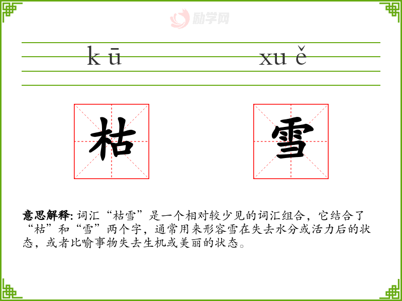 - 词源:“枯”字源自古代汉语,意为失去水分、变得干燥;“雪”字则指天空中降下的白色结晶体。