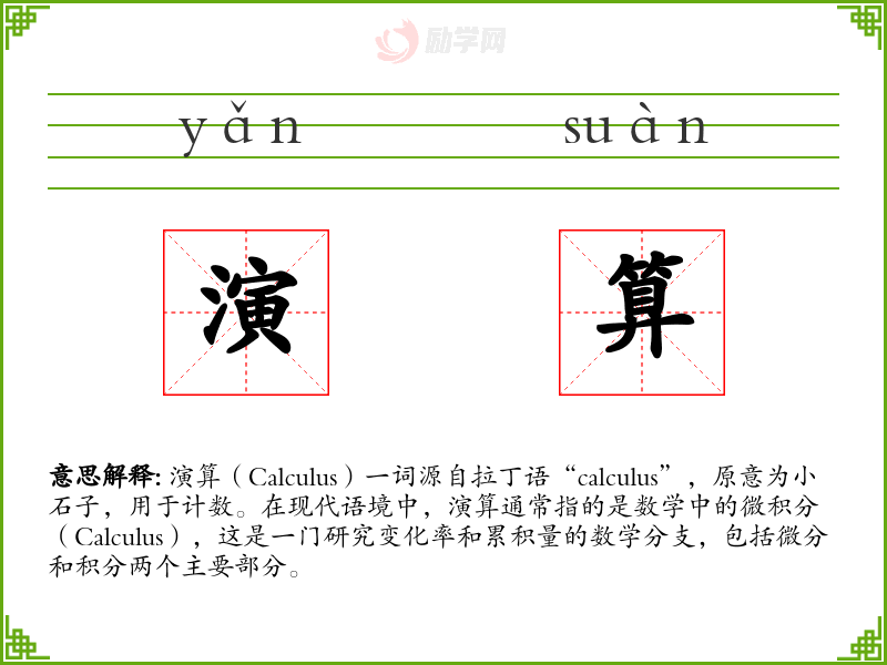 演算(Calculus)一词源自拉丁语“calculus”,原意为小石子,用于计数。在现代语境中,演算通常指的是数学中的微积分(Calculus),这是一门研究变化率和累积量的数学分支,包括微分和积分两个主要部分。