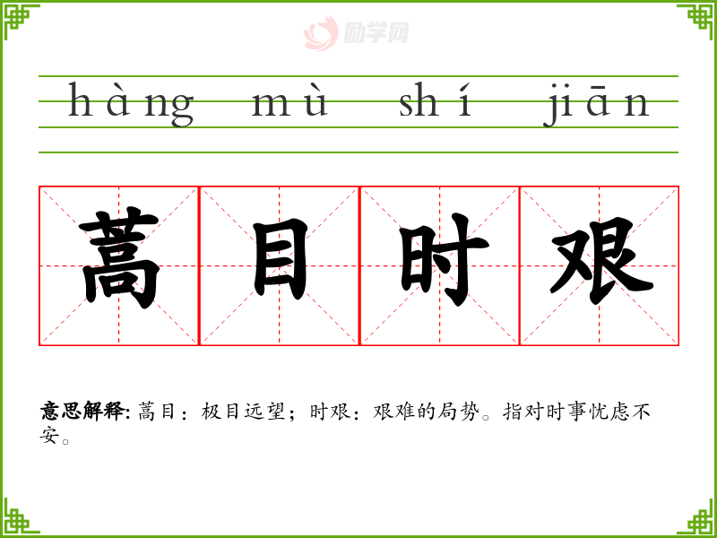 蒿目时艰的意思是:蒿目:极目远望;时艰:艰难的局势。指对时事忧虑不安。