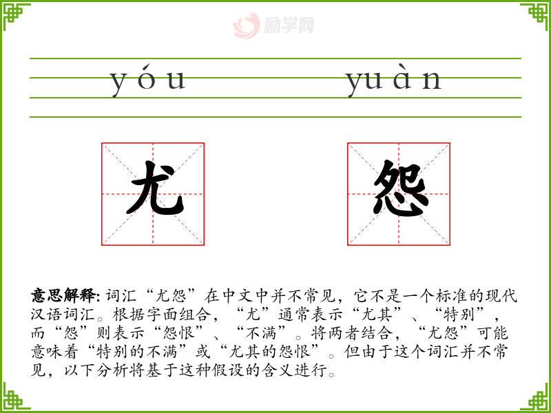 “尤怨”可以解释为一种特别强烈的不满或怨恨情绪,通常指向某人或某事感到特别的不公或不满足。