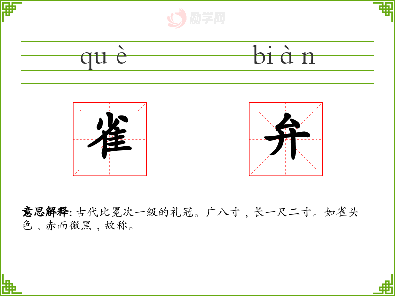 雀弁的意思是:古代比冕次一级的礼冠。广八寸﹐长一尺二寸。如雀头色﹐赤而微黑﹐故称。