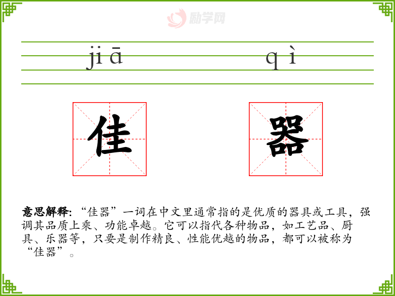 - 专业领域:在专业领域,如音乐、烹饪等,“佳器”特指那些专业级别的工具或设备。