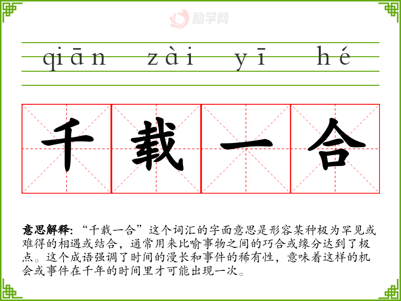 “千载一合”这个词汇的字面意思是形容某种极为罕见或难得的相遇或结合,通常用来比喻事物之间的巧合或缘分达到了极点。这个成语强调了时间的漫长和的稀有性,意味着这样的机会或在千年的时间里才可能出现一次。