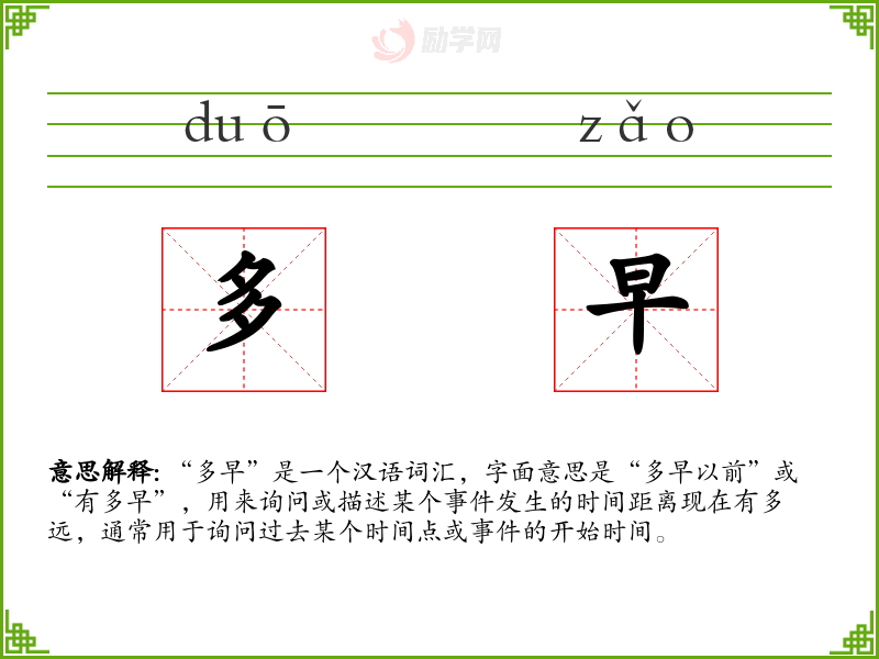 “多早”是一个汉语词汇,字面意思是“多早以前”或“有多早”,用来询问或描述某个发生的时间距离现在有多远,通常用于询问过去某个时间点或的开始时间。