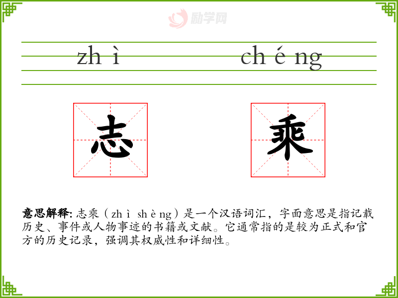 在文学中,“志乘”可能被用来指代古代的官方史书,如《史记》、《汉书》等,这些书籍详细记载了历史**和人物。在口语中,这个词可能不太常用,但在历史学或文献学的专业领域,它是一个重要的术语。