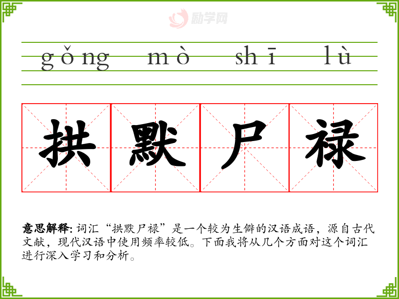 词汇“拱默尸禄”是一个较为生僻的汉语成语,源自古代文献,现代汉语中使用频率较低。下面我将从几个方面对这个词汇进行深入学*和分析。