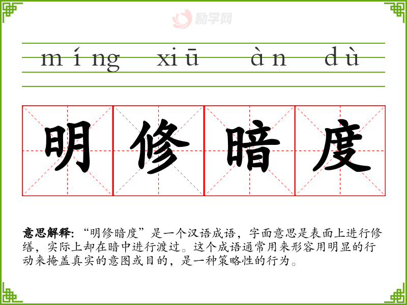 “明修暗度”是一个汉语成语,字面意思是表面上进行修缮,实际上却在暗中进行渡过。这个成语通常用来形容用明显的行动来掩盖真实的意图或目的,是一种策略性的行为。