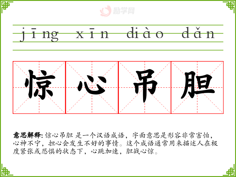 - 反义词:心安理得、泰然自若。这些词汇表达了平静和自信的状态,与“惊心吊胆”形成鲜明对比。