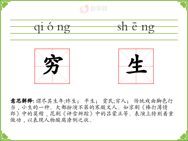 谓尽其生年;终生; 平生; 贫民;穷人; 传统戏曲脚色行当﹐小生的一种。大都扮演不第的寒酸文人。如京剧《棒打薄情郎》中的莫稽﹑昆剧《评雪辨踪》中的吕蒙正等。表演上特别着重做功﹐以表现人物酸腐潦倒之状。