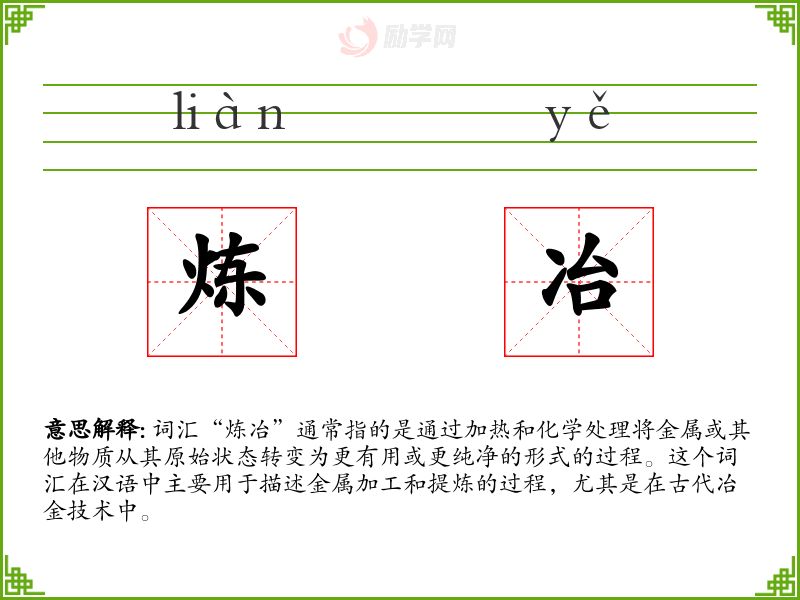 - 专业领域:在冶金学、材料科学和工业生产中,“炼冶”是一个专业术语,用于描述金属的提炼和加工过程。