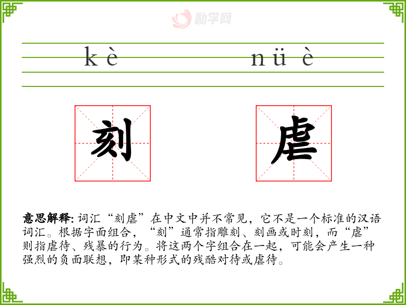 由于“刻虐”不是一个标准词汇,它的词源和演变难以追溯。它可能是由“刻”和“虐”两个字组合而成的新词,用于特定的文学或口语表达。