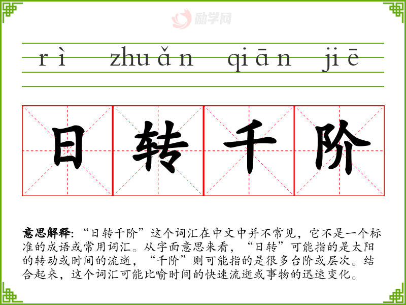 “日转千阶”这个词汇虽然不常见,但它提供了一个形象的比喻,用以描述时间的流逝和事物的变化。在学习语言和表达时,了解和掌握这样的创造性表达方式,可以丰富我们的词汇量和表达能力。