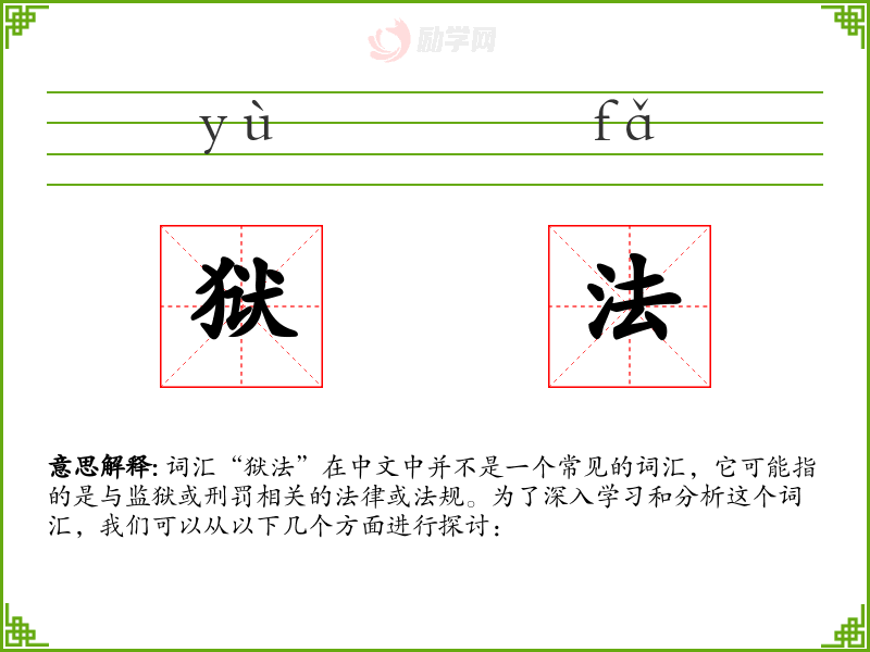 词汇“狱法”在中文中并不是一个常见的词汇,它可能指的是与监狱或刑罚相关的法律或法规。为了深入学*和分析这个词汇,我们可以从以下几个方面进行探讨: