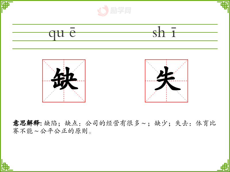 缺失的意思是:缺陷;缺点:公司的经营有很多~;缺少;失去:体育比赛不能~公平公正的原则。