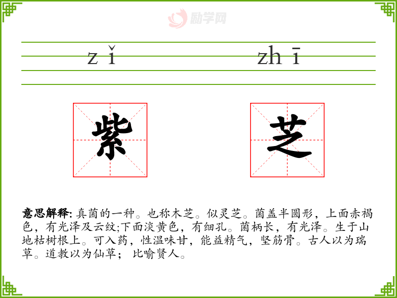 紫芝的意思是:真菌的一种。也称木芝。似灵芝。菌盖半圆形,上面赤褐色,有光泽及云纹;下面淡黄色,有细孔。菌柄长,有光泽。生于山地枯树根上。可入药,性温味甘,能益精气,坚筋骨。古人以为瑞草。道教以为仙草; 比喻贤人。