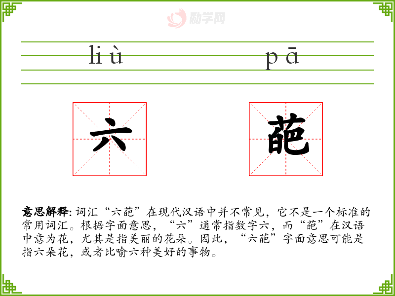词汇“六葩”在现代汉语中并不常见,它不是一个标准的常用词汇。根据字面意思,“六”通常指数字六,而“葩”在汉语中意为花,尤其是指美丽的花朵。因此,“六葩”字面意思可能是指六朵花,或者比喻六种美好的事物。